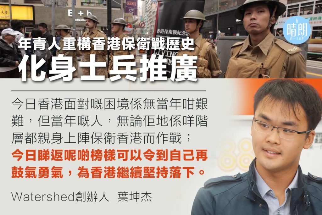 於過去數個周末,Watershed Hong Kong 連同士兵演員於尖沙咀、中環及灣仔向市民推廣香港保衛戰這段歷史。今日創辦人葉坤杰接受晴朗訪問時被問到這一段歷史對今日香港有何意義時,葉指今日香港面對的困境並沒有當年艱難,但當年的人,無論他們屬那一個階層,都會親身上陣保衛香港,但今天我們同樣面對問題,我們有能力時是會先思考移民,還是我們仍然可以為香港做點事情?今日回望當年的榜樣可以令到自己再鼓氣勇氣,為香港繼續堅持落下。