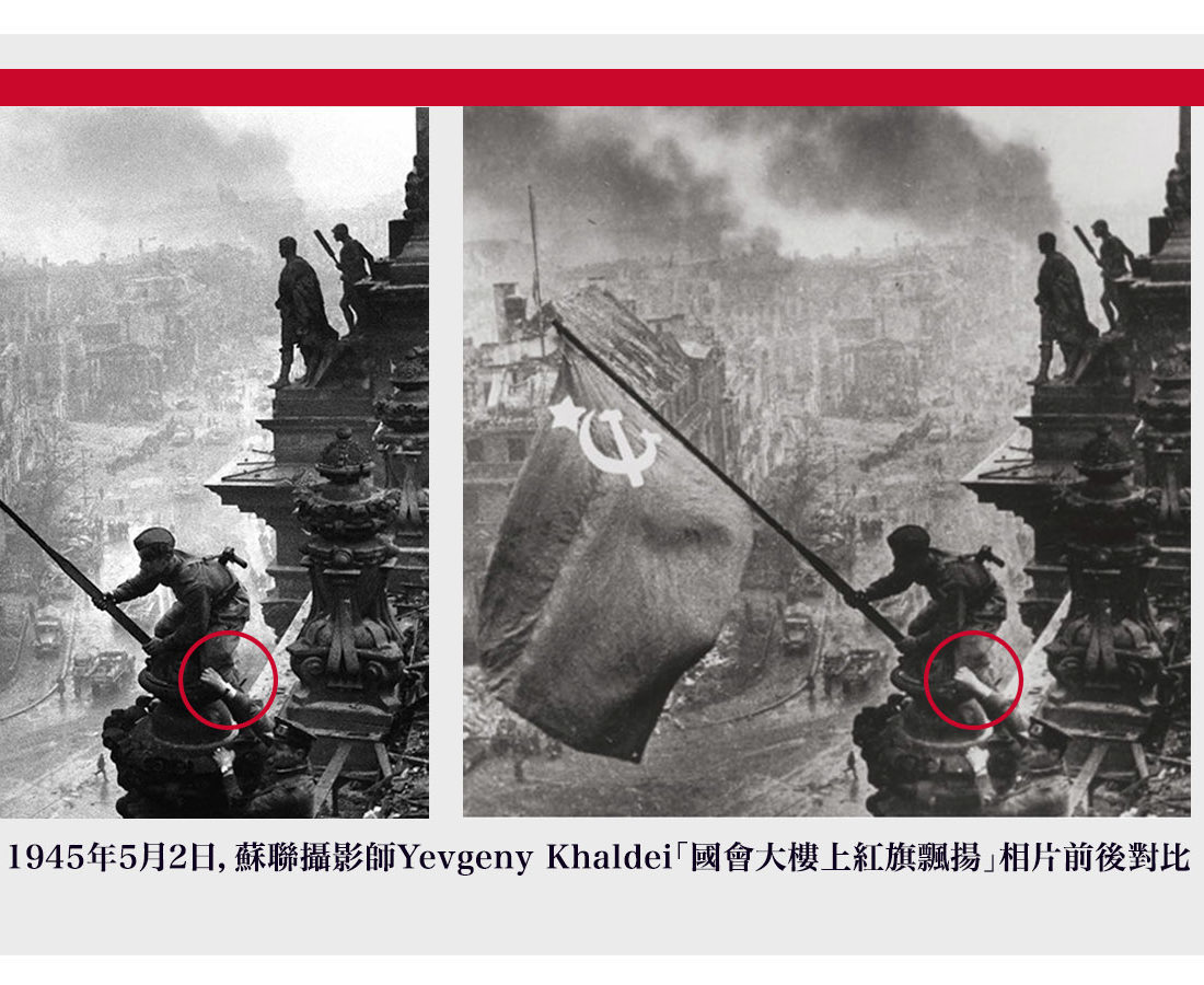 但是右下角軍官右手上一隻「多餘的手錶」明顯是掠奪而得,不符合蘇聯勝利所需求的形象,Khaldei便用針擦走了。刊登版本亦後製了背景的黑煙,令人感覺相片是戰鬥時拍下。