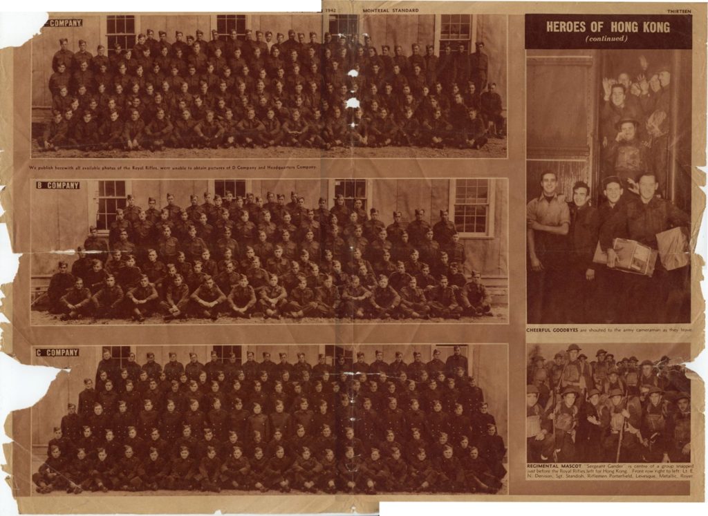 1942年《蒙特利爾畫報》刊出〈Heros of Hong Kong〉專題,刊登了兩營赴港加軍的合照,左下為加拿大皇家來福槍團第一營C連。