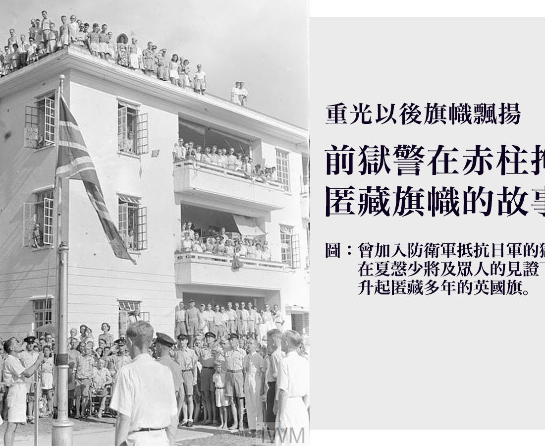 1945年8月15日,日本宣佈無條件投降,消息幾日後傳到香港,赤柱拘留營中3,000多名英籍及外籍被拘留人士失去自由多年,終於看到曙光。8月29日,英國艦隊抵港,翌日登陸部隊解放戰俘營和拘留營,並接收日軍戰俘,赤柱拘留營亦重新升起英國國旗。三年零八個月之後,港人終於看到重光的一天。帝國戰爭博物館(Imperial War Museum)藏有一幀當時的相片,片中旗手背後又有一段香港故事。
